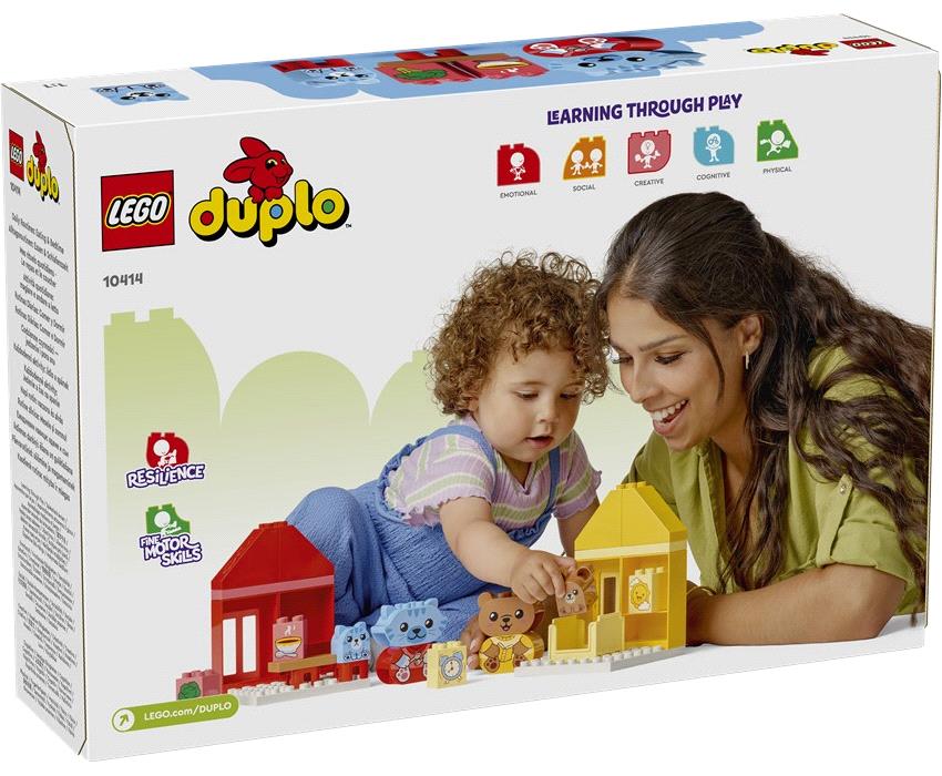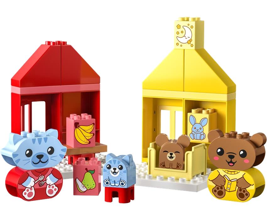 Το LEGO® DUPLO® My First Καθημερινές Ρουτίνες: Φαγητό & Ύπνος βοηθά το παιδί σας να κατανοήσει τη σημασία των καθημερινών ρουτινών. Αυτό το πολύχρωμο παιχνίδι μάθησης διαθέτει 2 οικογένειες ζώων – γάτα και γατάκι και αρκούδα και αρκουδάκι – που τρώνε το φαγητό τους και ετοιμάζονται για ύπνο. Κάθε μωρό ζωάκι έχει χαρούμενη και γκρινιάρικη έκφραση για να βοηθήσει τα παιδιά προσχολικής ηλικίας να εκφράσουν τα συναισθήματά τους γι αυτές τις δραστηριότητες.