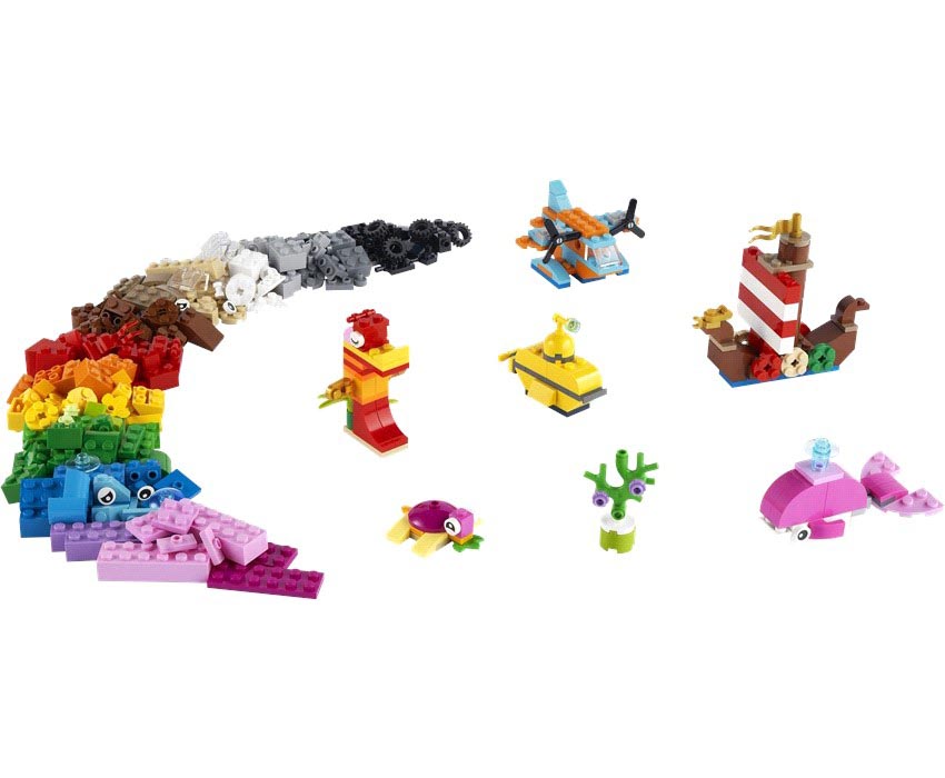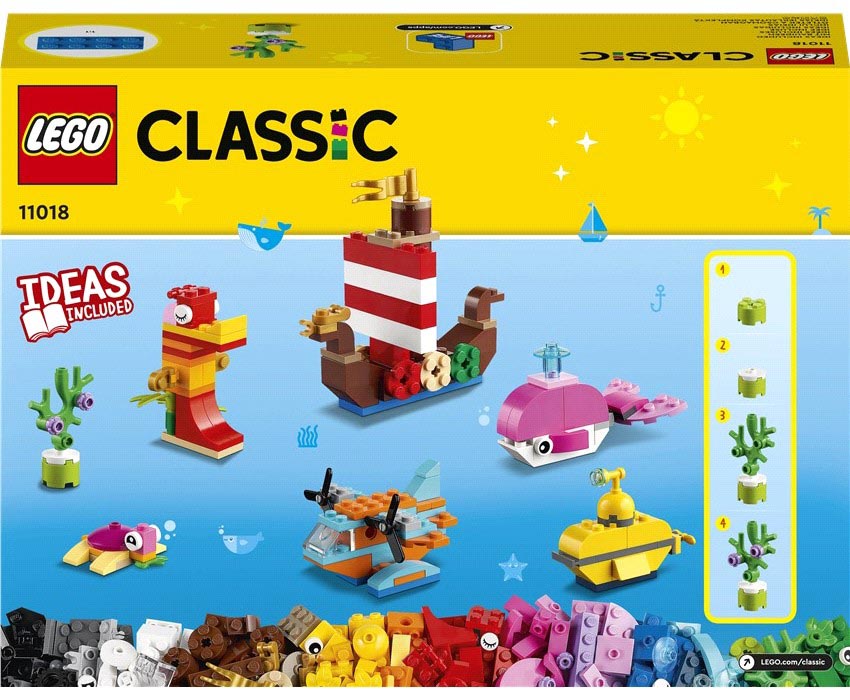 Ανοίξτε νέους ορίζοντες στη μάθηση μέσα από το παιχνίδι με το σετ LEGO® Classic Δημιουργική Θαλασσινή Διασκέδαση, που περιλαμβάνει πολύχρωμα LEGO κομμάτια και εικονογραφημένες οδηγίες για 6 μίνι κατασκευές. Παιδιά, φίλοι και οικογένειες μπορούν να πάρουν μέρος στη διασκέδαση για να δημιουργήσουν ένα πλοίο Βίκινγκ, ένα κίτρινο υποβρύχιο, ένα υποβρύχιο ντρόουν, έναν ιππόκαμπο, φάλαινα και χελώνα, πριν ανοίξουν τις 2 σακούλες με τα επιπλέον τουβλάκια για να φτιάξουν τις δικές τους LEGO δημιουργίες.