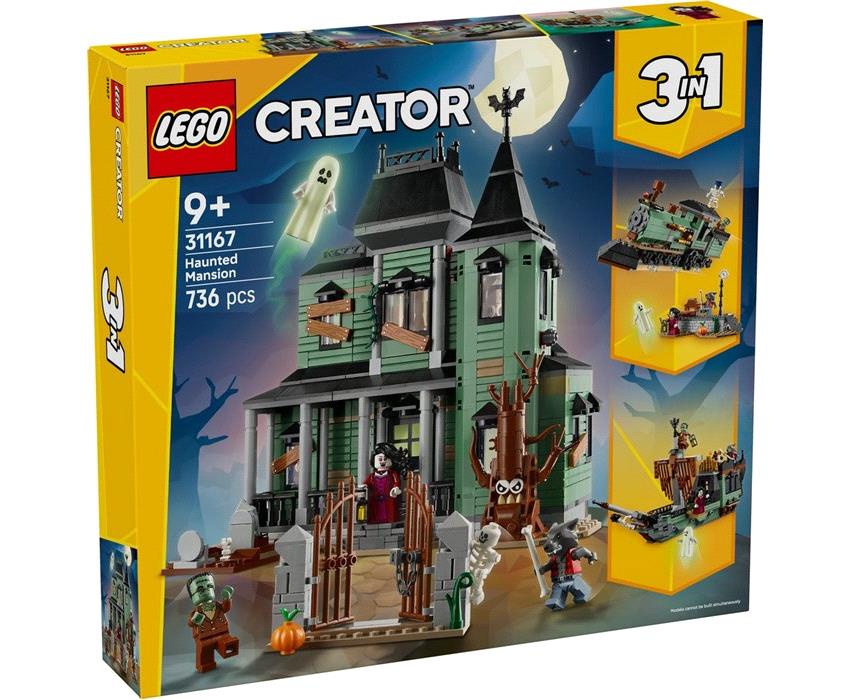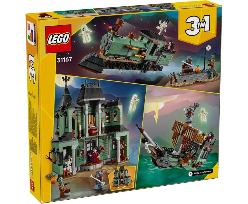 Τολμάς να μπεις στη Στοιχειωμένη Έπαυλη; Προσπάθησε να μην τρομάξεις με το χέρι που βγαίνει από έναν τάφο, το τρομακτικό δέντρο και το φάντασμα που κρύβεται στο σπίτι. Πρόσεχε τη βρικόλακα, τον λυκάνθρωπο, το τέρας του Φρανκενστάιν, τον σκελετό και μια μίνι φιγούρα φαντάσματος που λάμπει στο σκοτάδι! Ανακατασκεύασέ την σε στοιχειωμένο πλοίο ή τρένο. Η επιλογή είναι δική σου με αυτό το σετ 3σε1.