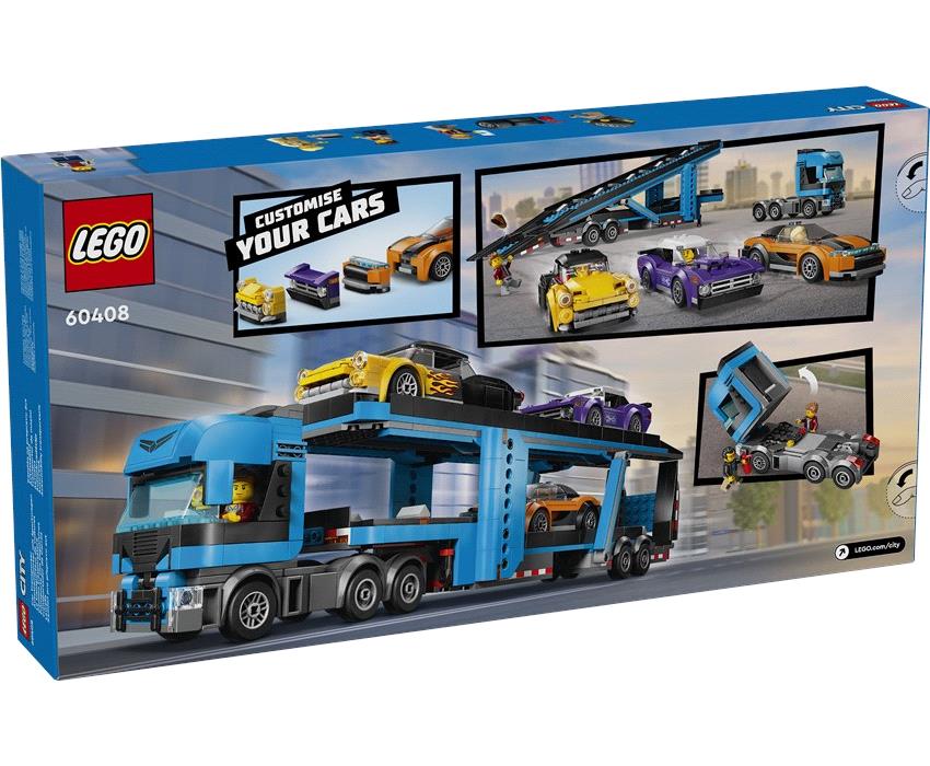 Ο μεταφορέας αυτοκινήτων LEGO® City έφτασε! Αυτό το διώροφο μεταφορικό είναι σαν το αληθινό. Γείρε την καμπίνα του οδηγού για πρόσβαση στον κινητήρα, σύνδεσε το τρέιλερ και κατέβασε το πάνω επίπεδο και τις ράμπες για να φορτώσεις το tail dragger των ’50s, το muscle car των ’70s και το μοντέρνο ηλεκτρικό αυτοκίνητο. Όταν τα αυτοκίνητα φορτωθούν, μπες στο τιμόνι και ξεκίνα!