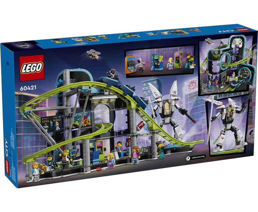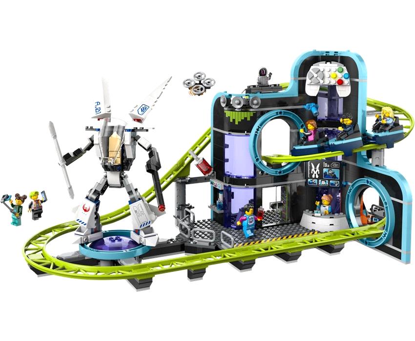 Ανέβα στο LEGO® City ρόλερ κόστερ! Κρατήσου καλά καθώς τα βαγόνια ανεβαίνουν και μετά ξεχύνονται σε έναν λαβύρινθο από στροφές και ευθείες που διασχίζουν αυτόν τον φουτουριστικό χώρο. Κάνε μια βόλτα με την τεράστια εξωστολή. Δες τις απίθανες κονσόλες gaming. Πήγαινε στην αρένα των e-αθλημάτων ή δοκίμασε τον ρομποτικό χορό και, μετά, πέρασε από το μπαρ με τις γρανίτες για να δροσιστείς.