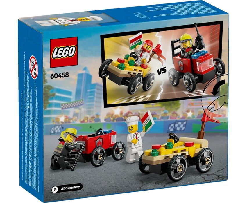 Εξοπλίσου για επικές αναμετρήσεις soapbox με το Πακέτο Αγωνιστικών Αυτοκινήτων – Φορτηγάκι Πίτσας vs. Πυροσβεστικό Φορτηγό. Οι αστικοί αγώνες κατέφτασαν στη LEGO® City με καυτό ανταγωνισμό! Βάλε το καυτερό κομμάτι πίτσας εναντίον του κατακόκκινου πυροσβεστικού φορτηγού και ξεκίνησε τον αγώνα! Ποιος θα τερματίσει πρώτος; Ο σεφ ή ο πυροσβέστης; Ετοιμάσου για δράση με τέρμα το γκάζι!