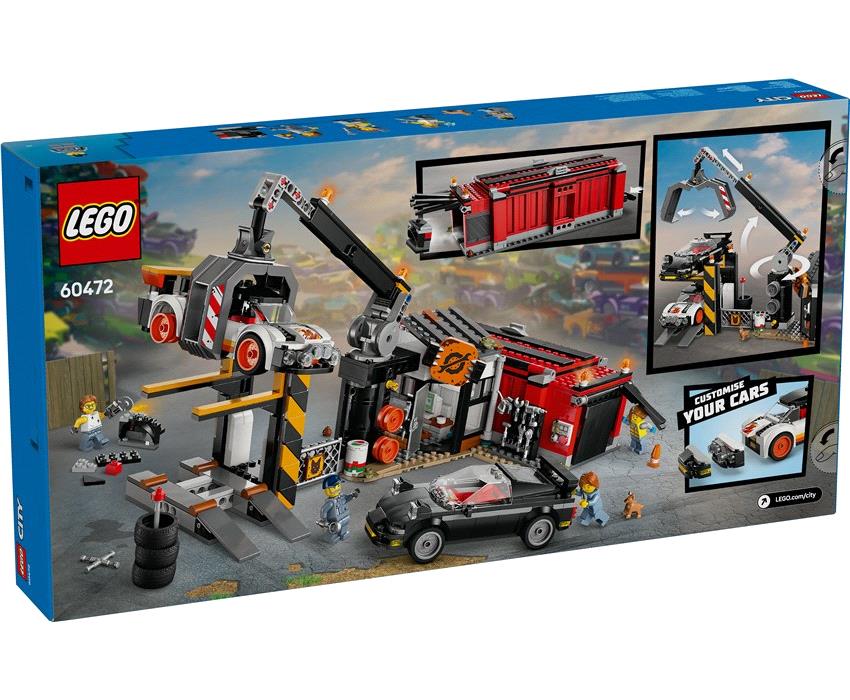 Καλώς ήρθες στη μάντρα της LEGO® City, όπου η ομάδα δίνει νέα ζωή σε παλιά αυτοκίνητα. Δες τα διασωθέντα ανταλλακτικά, απίθανες ζάντες και ποιοτικά ελαστικά που πουλάει το κατάστημα! Πιάσε ένα κλειδί από την εργαλειοθήκη και αποσυναρμολόγησε εξαρτήματα από 2 κλασικά αυτοκίνητα των ’80s. Σήκωσέ τα με τον γερανό και βάλε τα στην πρέσα για να τα μεταμορφώσεις σε κύβους μετάλλου σκραπ. Εκπληκτικό!