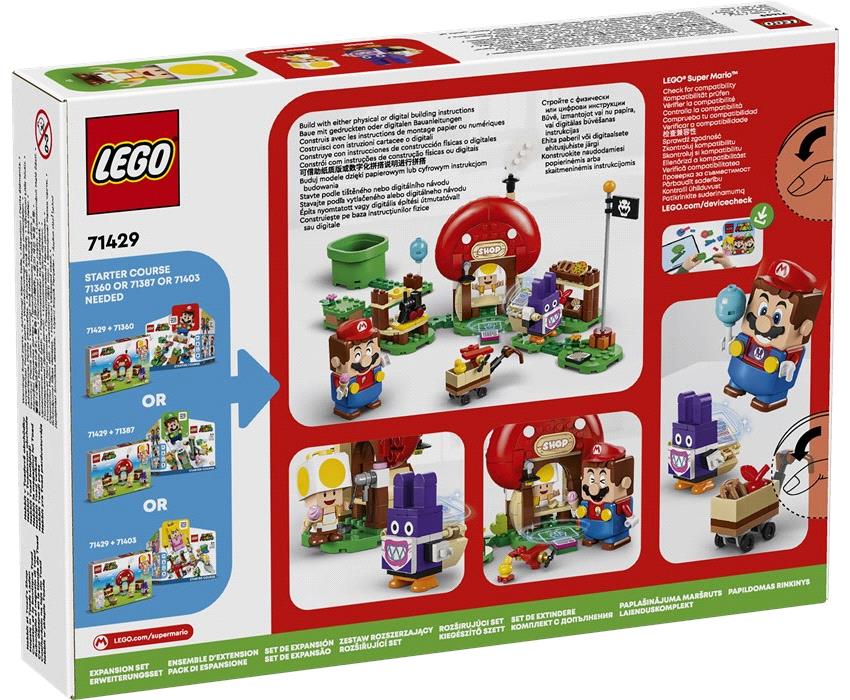 Κάνε μια επίσκεψη στο πολύχρωμο κατάστημα του Yellow Toad! Βοήθησε τον Yellow Toad να σερβίρει παγωτό. Αγόρασε ένα παιχνίδι αεροπλάνο, τρένο, μπαλόνι ή ακόμα και μια πάπια σε πατίνι! Διάλεξε ανάμεσα σε ένα μήλο, πρέτσελ, μπισκότο ή πίτσα από τον πάγκο φαγητού. Μετάφερε τα πράγματά σου μέσα στην τσάντα του Nabbit ή με το καροτσάκι. Κάλεσε τον LEGO® Mario™, τον LEGO® Luigi™ ή τη LEGO® Peach™ (οι φιγούρες δεν περιλαμβάνονται) στο κατάστημα για επιπλέον διαδραστική διασκέδαση.