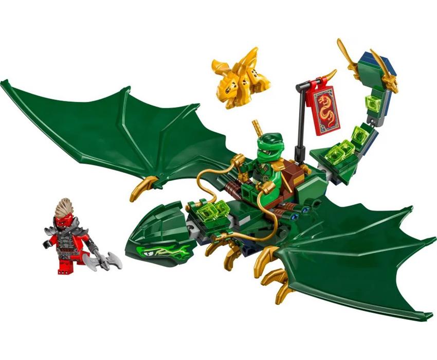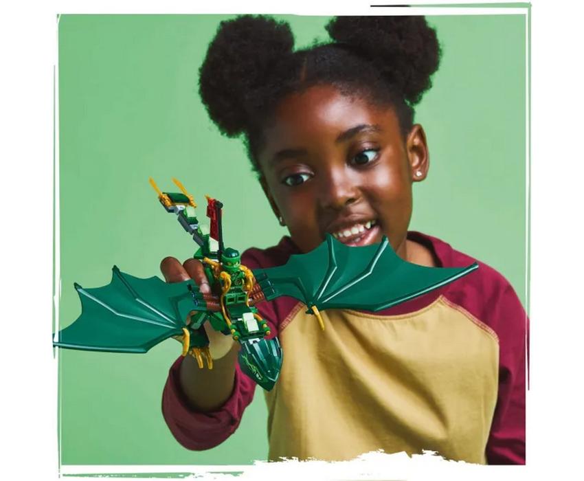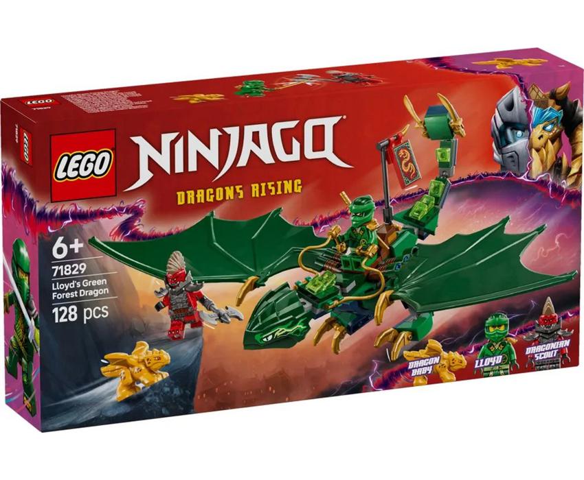 Αγόρια και κορίτσια ηλικίας 6 ετών και άνω ανεβαίνουν ψηλά στον ουρανό για να αναπαραστήσουν εναέριες σκηνές από τη σεζόν 3 της τηλεοπτικής σειράς NINJAGO® Η Άνοδος των Δράκων με το σετ κατασκευής LEGO Ninjago Lloy’s Green Forest Dragon (71829). Διαθέτει έναν εντυπωσιακό δράκο με αρθρωτή ουρά, λαιμό, πόδια, μεγάλα φτερά και χέρια, καθώς και σέλα για να κάθεται στην πλάτη του μια μίνι φιγούρα. Αυτό το σετ δράκου LEGO® NINJAGO συνοδεύεται επίσης από 2 μίνι φιγούρες: Lloyd οπλισμένος με χρυσό σπαθί κατάνα και μοχθηρός Dragon Ανιχνευτής με τσεκούρι συν ένα χρυσό μοντέλο μωρού Dragon για να μπορούν τα παιδιά να απολαμβάνουν παιχνίδι ρόλων με δράση και φροντίδα.